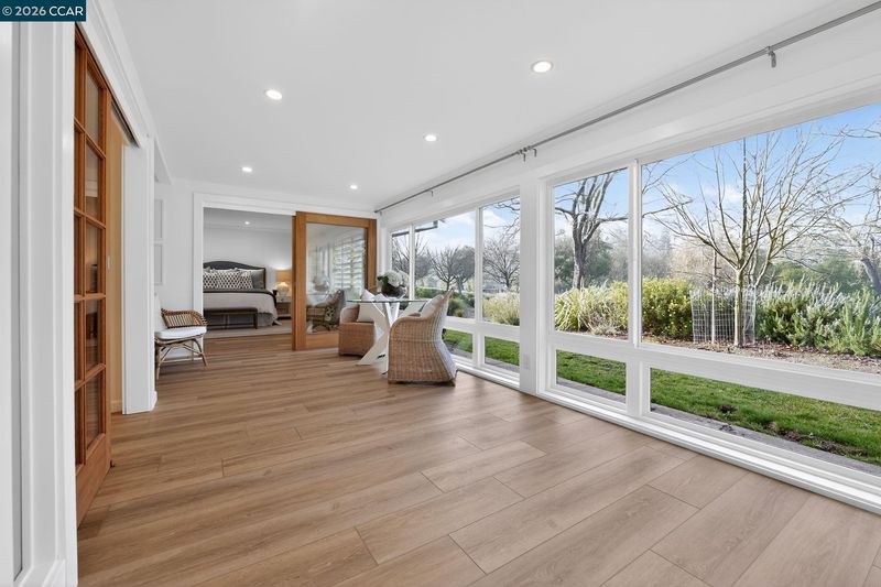 This beautifully updated Whitney floor plan showcases a fresh, modern interior in a prime central location. Featuring 2 spacious bedrooms, 2 stylish bathrooms, and a convenient den near the entrance, this layout is both functional and welcoming. The bright living room features vaulted ceilings with recessed lighting and a cozy electric fireplace, seamlessly leading into a sunroom with stunning golf course views. Culinary enthusiasts will love the eat-in kitchen, featuring floor-to-ceiling cabinets, new granite countertops, and stainless steel appliances. The elegant formal dining room adds a touch of sophistication. Both bathrooms have been tastefully renovated, featuring marble countertops and accessible showers. The primary bathroom is equipped with a self-cleaning Smart toilet. The oversized bedrooms offer ample closet space and an indoor laundry room. Attached garage with extra storage. Enjoy the unbeatable convenience of being just a short distance or golf cart ride from Rossmoor's Event Center, Dollar Clubhouse, Creekside Restaurant, and two beautiful golf courses!