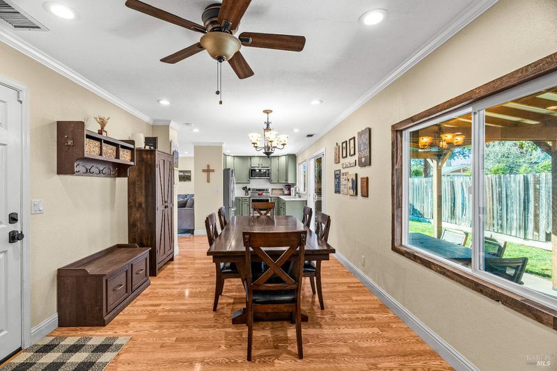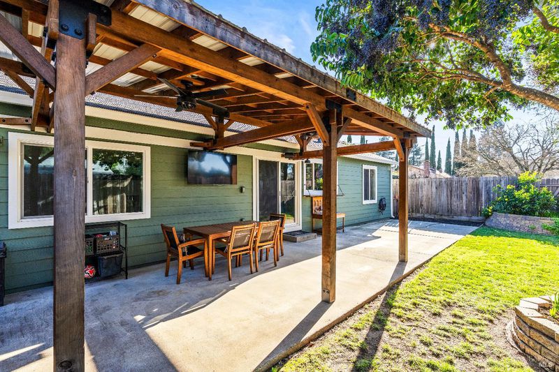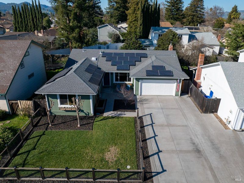 Beautifully updated single-level North Napa home offering an open, light-filled floor plan ideal for modern living. The kitchen features Cambira quartz countertops and flows seamlessly into the living and dining areas with LED recessed lighting, Pergo laminate flooring, and a stately fireplace. The home includes three bedrooms, including a private primary suite, and a two-car garage. Extensive improvements include a 30-year composition roof, exterior paint, HVAC furnace and condenser, concrete driveway and walkways, and a 50-gallon water heater. Energy-efficient features include a QuietCool whole-house fan, whole-house and under-sink water filtration systems, and a 6.0 kW Tesla solar panel system offering significantly reduced electrical costs. The spacious front and backyard are enhanced with custom redwood accents, outdoor lighting, and mature lemon and lime trees. An insulated Tough Shed with electrical and laminate flooring provides ideal flex space for a home office or studio. A well-maintained home combining comfort, efficiency, and North Napa appeal.