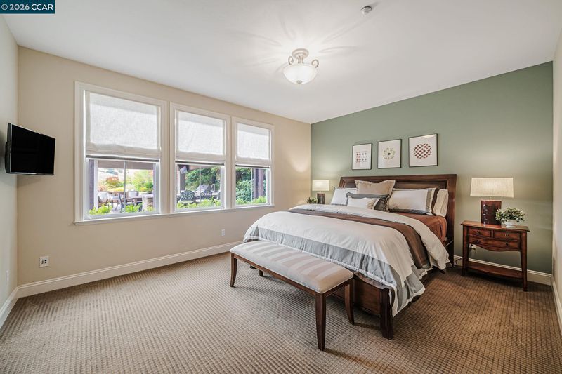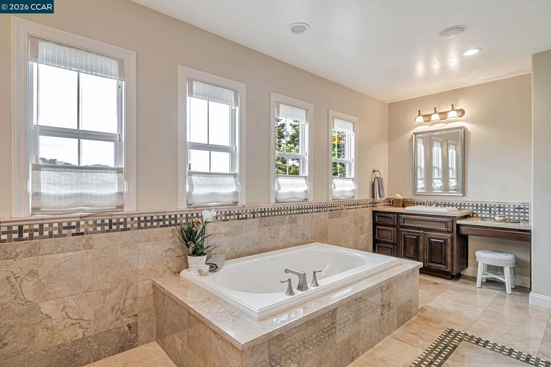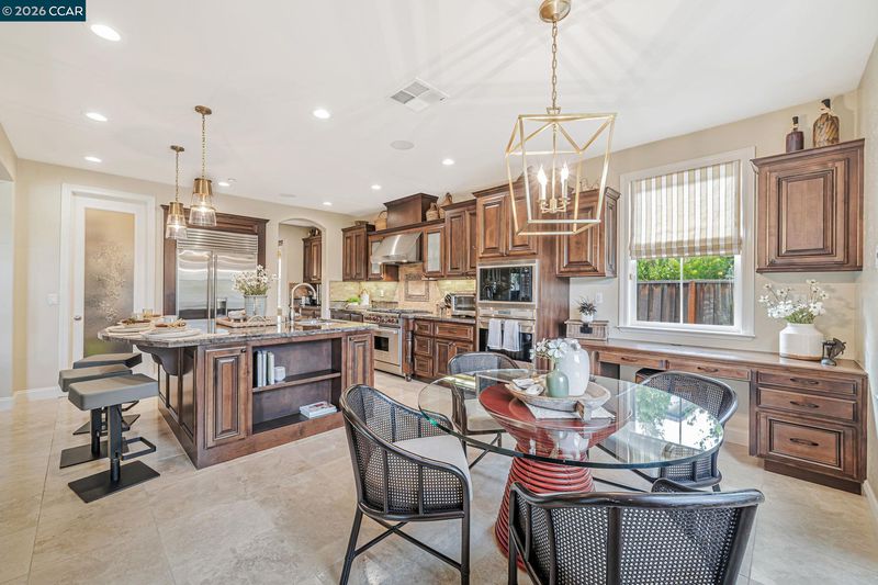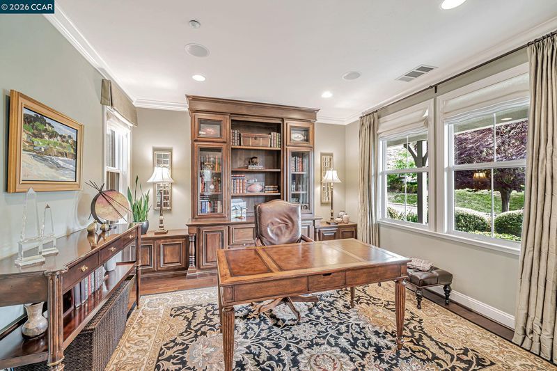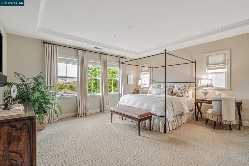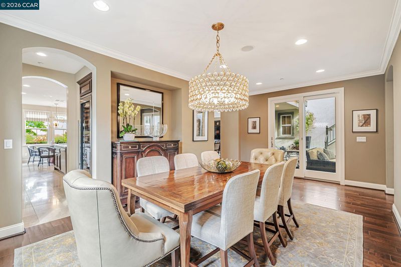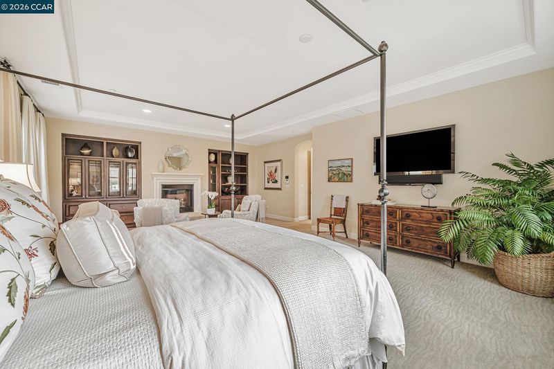 This breathtaking two-story estate offers 6 bedrooms, 6.5 baths, and resort-style luxury in one of Danville’s most coveted neighborhoods. Enter to soaring ceilings, abundant natural light, rich cherry hardwood floors, crown molding, built-in speakers, refined custom finishes and a full security system. To the left, an elegant formal living room with a white mantel and gas fireplace; to the right, a sophisticated den with custom cherry built-ins, ideal for a home office. The chef’s kitchen features a grand island, sumptuous cherry cabinetry, stainless steel appliances with a six-burner stove, and a butler’s pantry with wine fridge opening to an expansive dining room. The lavish primary suite showcases stunning Mt. Diablo views, a spa-like bath with soaking tub, dual vanities, walk-in shower, and a massive custom walk-in closet. Step outside to a private courtyard with fireplace and a fully equipped in-law suite with kitchen, bath, balcony, and separate entry. The entertainer’s backyard dazzles with panoramic Mt. Diablo views, a heated saltwater pool, spa, bocce court, garden beds, and a peaceful fountain. The outdoor kitchen is a chef’s dream with built-in grill, fireplace, warming drawers, fridge, dishwasher, and sink—perfect for luxurious outdoor living.