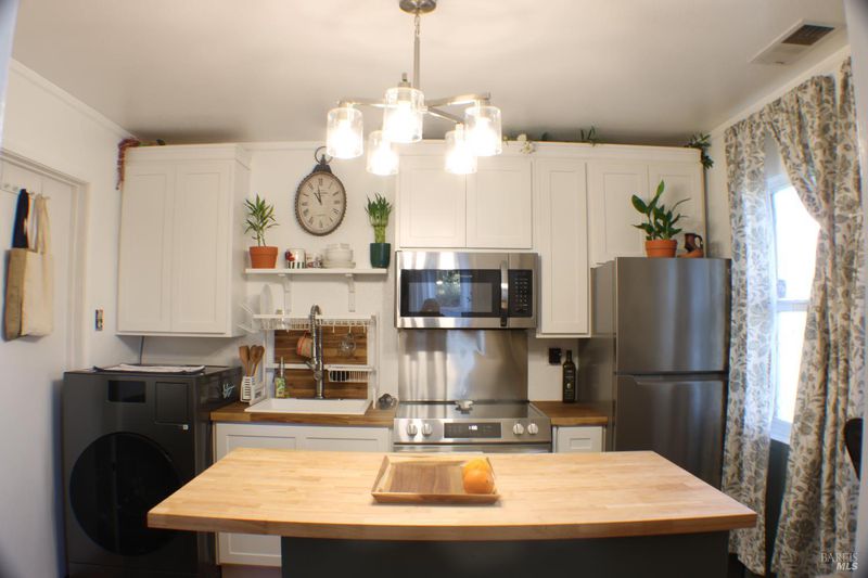 This sweet and stylish 2-bedroom, 1 bath home has been tastefully remodeled and is move-in ready. Featuring a remodeled kitchen and bathroom that brings a fresh, modern feel, all while embracing its vintage 1931 charm. The home features central heat/AC, dual pane windows & has been lovingly cared for. Recent upgrades in 2025 include; Custom butcher block center island kitchen with butcher block countertops, cabinetry, appliances, wainscoting, a fully remodeled bathroom with 5' shower, attic insultation, refinished hardwood flooring, interior paint, and a covered patio. In addition, the main electrical panel was replaced in 2024. Beautiful plantings include birds of paradise, camellia, crepe myrtle, agapanthuses, and Japanese boxwoods. Enjoy the central location with all Santa Rosa has to offer, shopping, restaurants, SRJC, restaurants, breweries, parks & outdoor activities. Commuting is a breeze with both Santa Rosa SMART trains, highway 101 & bike paths nearby.