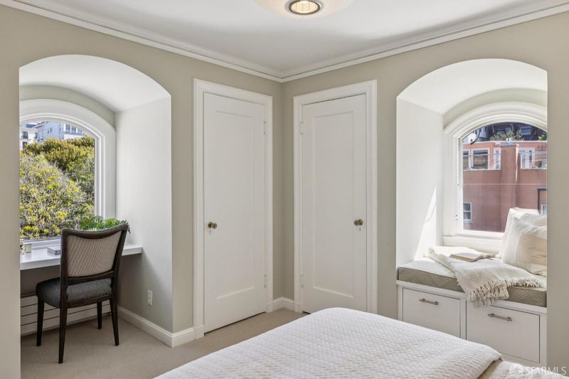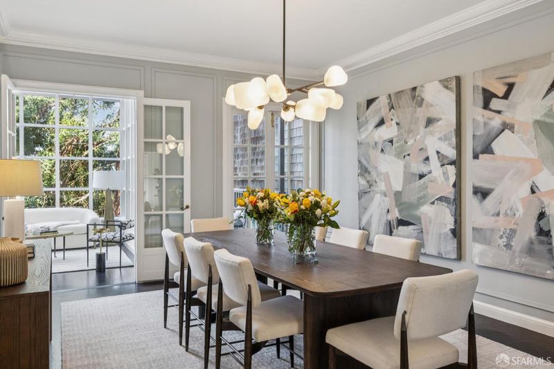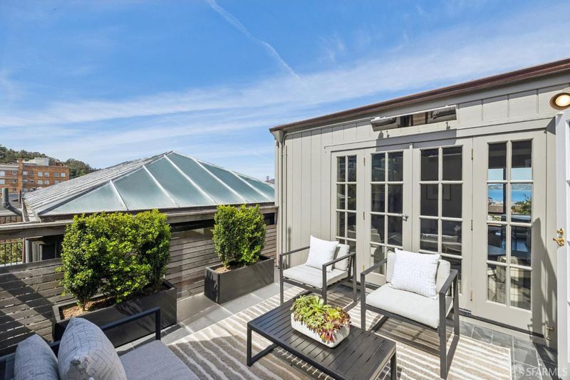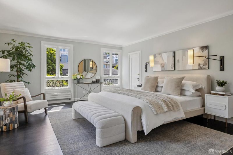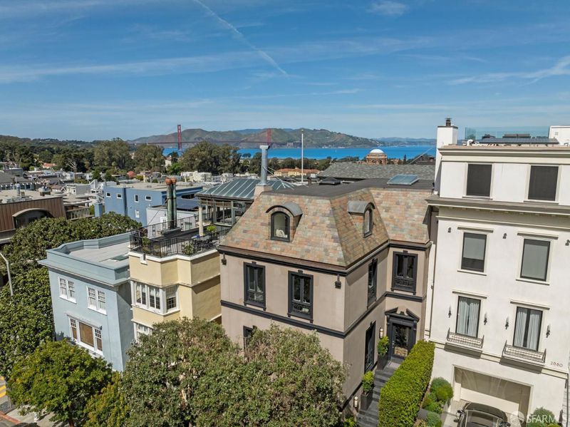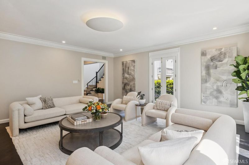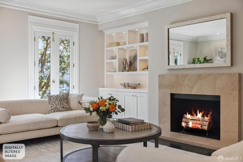 Poised where Cow Hollow meets Pacific Heights and the Presidio, this exquisite French-style residence offers 4 bedrooms, 4.5 baths, and spectacular Golden Gate, Bay, and Palace of Fine Arts views. The gracious main level features a stunning living room with three sets of French doors and a focal fireplace, a spacious formal dining room opening to a deck, a light-filled solarium, a beautifully renovated kitchen, and a powder room. The second floor includes three bedrooms, among them the primary suite with multiple French windows, Pacific Heights views, and an en-suite marble spa bath. The extraordinary top-floor family room - with trussed ceilings, limestone fireplace, and full-span bridge views - opens to a sunny southwest terrace with wall mounted heaters for entertaining in any season. A guest suite, gym, wine cellar, garden with turf and deck, and 3-car garage complete this exceptional home on one of San Francisco's most coveted blocks. (Photos marked 'Digitally Altered' show only the addition of fire in the fireplaces.)