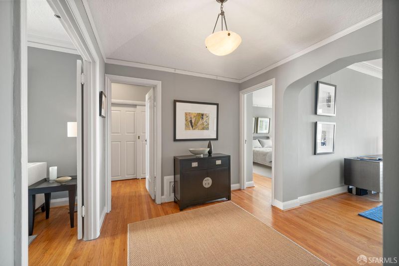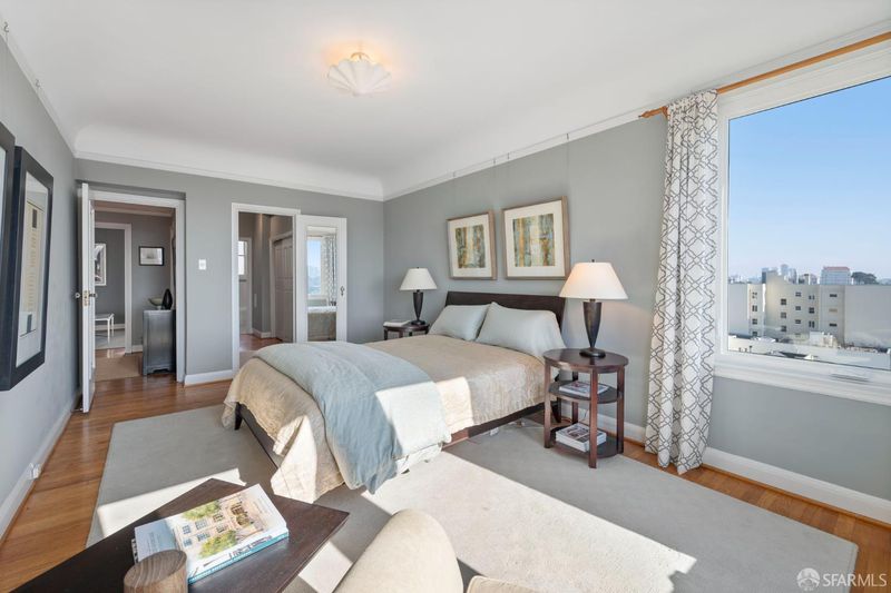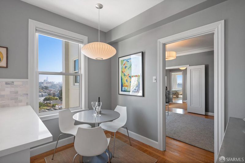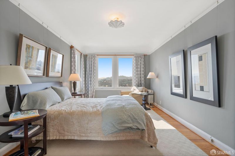 Perched in the heart of Pacific Heights, this beautifully renovated 1-2 bedroom corner residence offers breathtaking San Francisco VIEWS from every room and timeless sophistication. Thoughtfully renovated, this home blends classic architectural details with modern upgrades throughout. Expansive windows fill the home with natural light while framing iconic outlooks of the city. Gorgeous hardwood floors, elegant moldings, and SF charm enhance the home's inviting character. The renovated chef's kitchen features stylish quartz countertops and SS appliances, with an inviting eat-in breakfast nook. A versatile floor plan allows for use as a spacious one bedroom with office and formal dining room, or a comfortable two-bedroom layout, with a remodeled bathroom showcases contemporary finishes and refined design. Additional conveniences include dedicated garage parking, two massive walk-in closets, and exclusive storage unit, situated within this Art Deco 1929 boutique elevator building. Ideally located near Alta Plaza Park, the Presidio, and the vibrant Fillmore and Sacramento Street corridors. This home enjoys a 91 Walk Score with effortless access to top dining, shopping, and transit. A rare opportunity to experience elevated Pacific Heights living with stunning views and modern luxury.