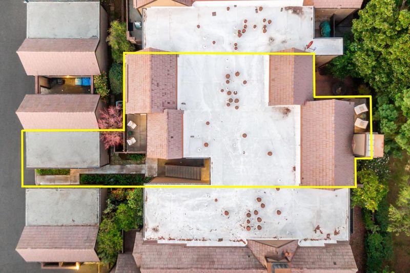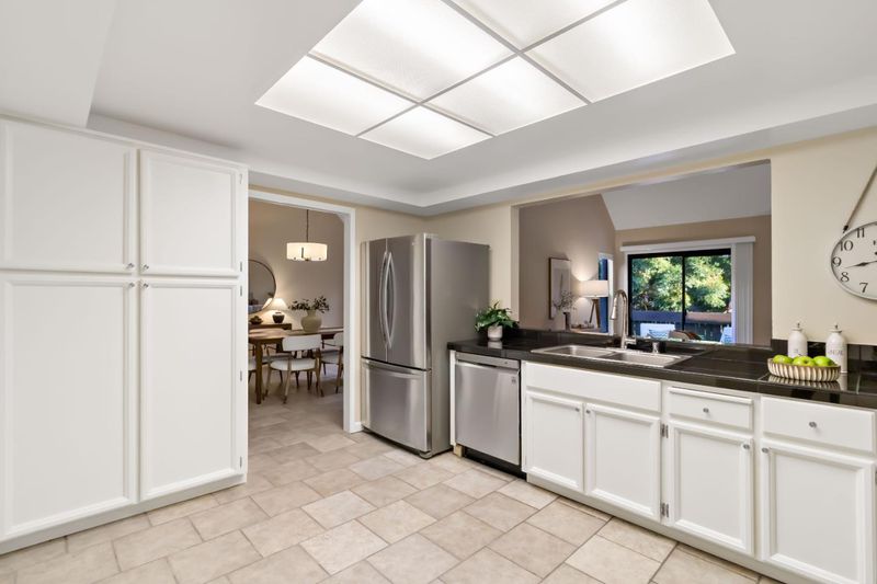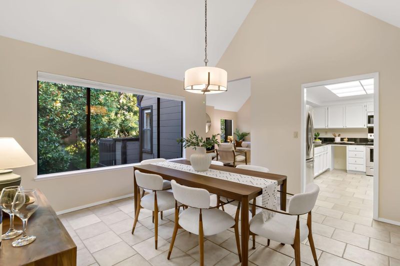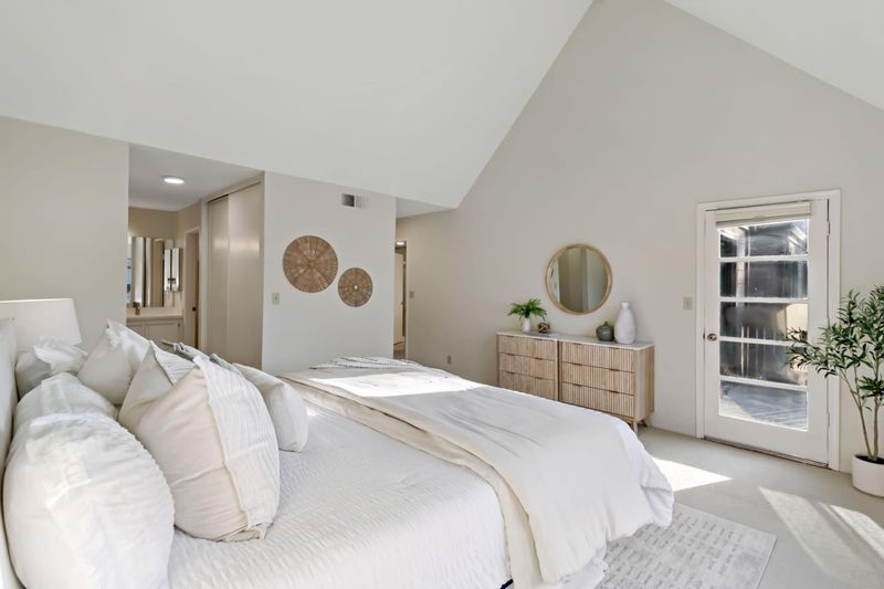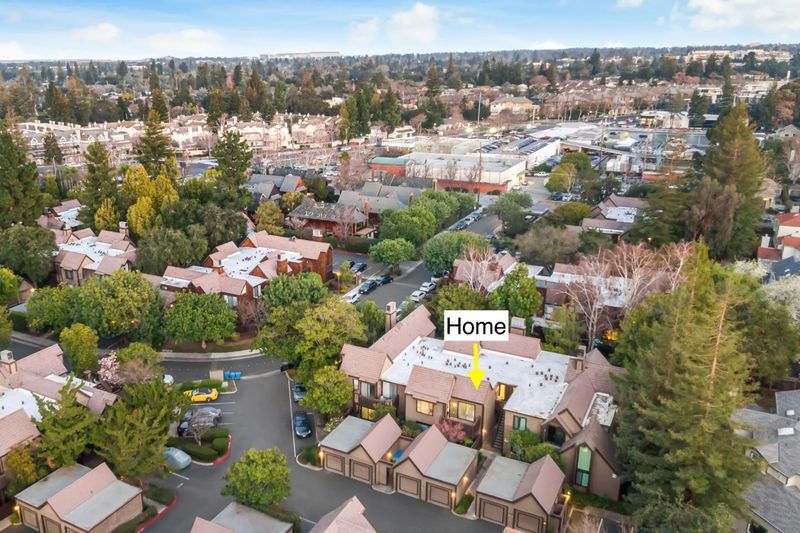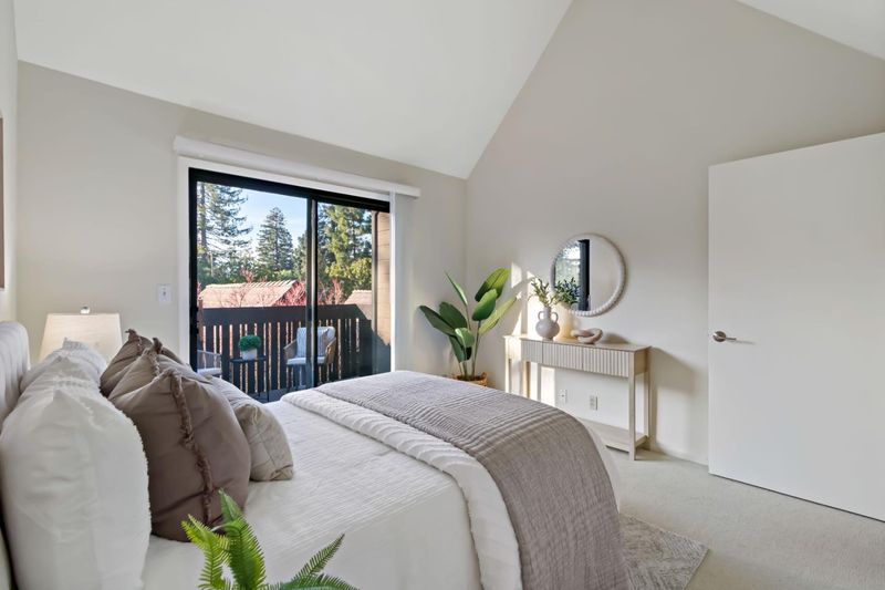 Top-floor Barron Square condo in a serene, tree-filled community. Spacious living room with vaulted ceilings, fireplace, wood floors, and a private balcony. Kitchen features stainless steel appliances and granite tile countertops, opening to a formal dining room with soaring ceilings and a large picture window. Expansive primary suite offers three closets and an en-suite bath with dual sinks and a quartz countertop. The guest bedroom shares access to a second balcony with afternoon sun. Oversized laundry room provides exceptional storage and may also function as a home office. Comfortable year-round living with central heating and air conditioning, along with a private one-car garage and an additional assigned parking space. Community amenities include a clubhouse, pool, indoor spa, sauna and tennis court. Located ideally close to parks, Stanford Nexus shopping and dining, and top Palo Alto schools.