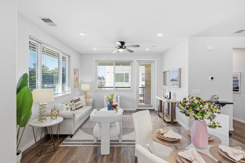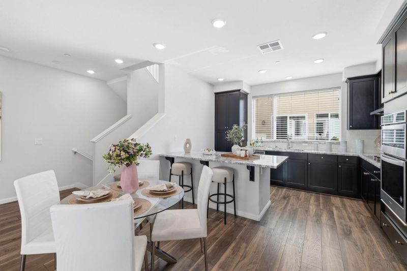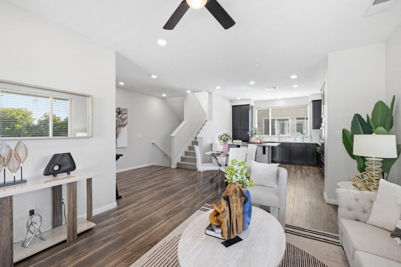 Modern corner-unit home in North San Joses Berryessa corridor, offering an open-concept layout with high ceilings, abundant natural light, and luxury plank flooring. The chefs kitchen features quartz countertops, ebony cabinetry, stainless steel appliances, and a breakfast bar, opening to a wrap-around balcony. The primary suite includes a spa-inspired en-suite and walk-in closet, with two additional bedrooms and a full bath providing flexible living options. The entry level offers a foyer, versatile den, and direct access to a two-car garage. Owned solar panels enhance energy efficiency. Prime location near major freeways, VTA, BART, Costco, H-Mart, Alum Rock Park, and Penitencia Creek trails, with convenient access to shopping, healthcare, and top-rated schools.