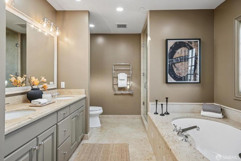 - Double Sinks, Radiant Heat, Steam, Tile, Tub w/Shower Over