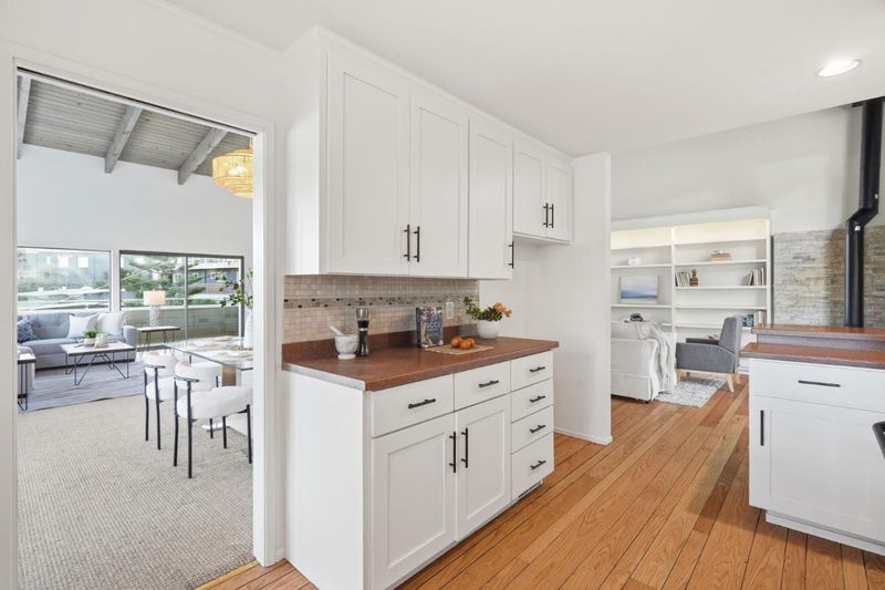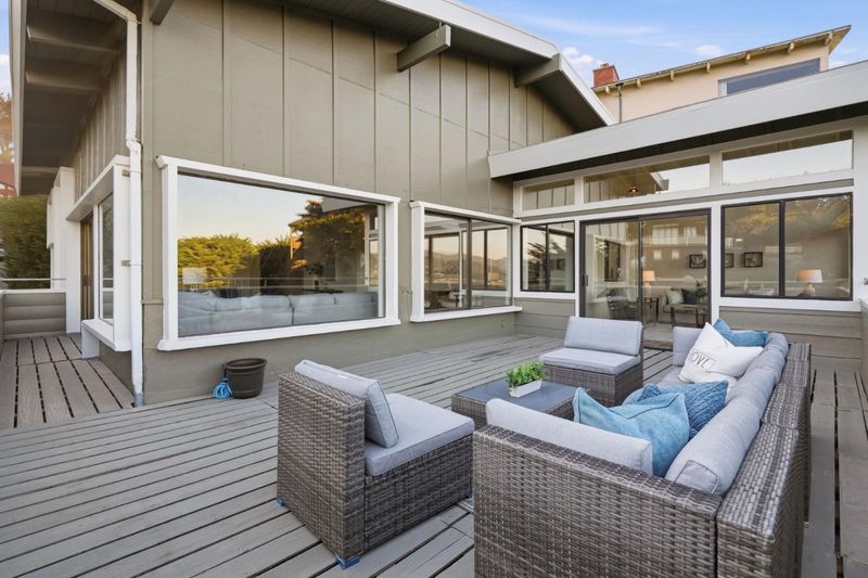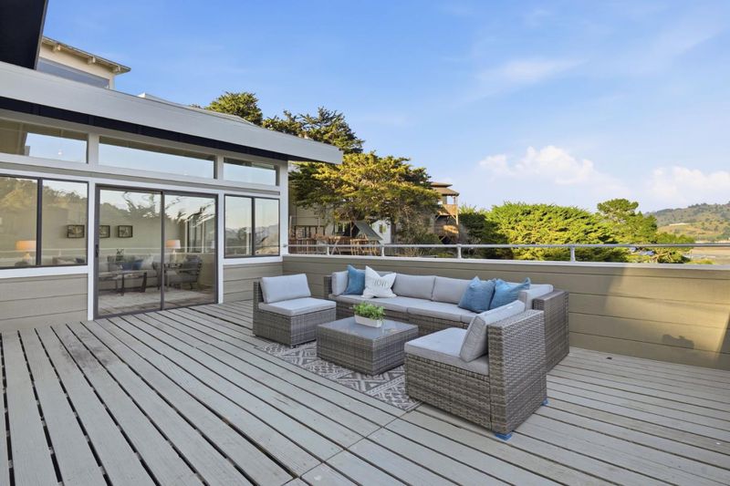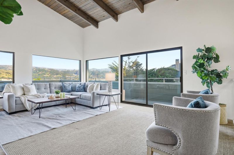 Classic Pedro Point home with ocean, mountain, and coastal views offers a warm and Zen contemporary style of living. Dramatic open beamed wood ceilings and open living room and dining room spaces invite tranquility as you admire the views from the large picture windows of the landscape and natural beauty of the coast. Designed to invite a casual lifestyle with lots of windows drenching the living spaces with sunshine. Choose from multiple locations in the home to relax, read, entertain, work, or play. The den/TV room off the kitchen has a wall of bookshelves for the avid reader or use to display your valuable collectibles or set up the space for your entertainment/fun area. There is a sunroom available for a multiple of uses either for gazing at the views or an extra area to entertain and play games. Off this room you have access to the roof decking where you can marvel at the views at sunrise or the magical hour of twilight. The primary suite offers extra sitting room, a walk-in closet, and a designer bathroom with double shower heads. Need a separate office space? Look no further as this bonus area has its own exterior entrance and plenty of extra storage. Hear the waves crash from the side yard garden patio area. Experience this unique Pedro Point home.