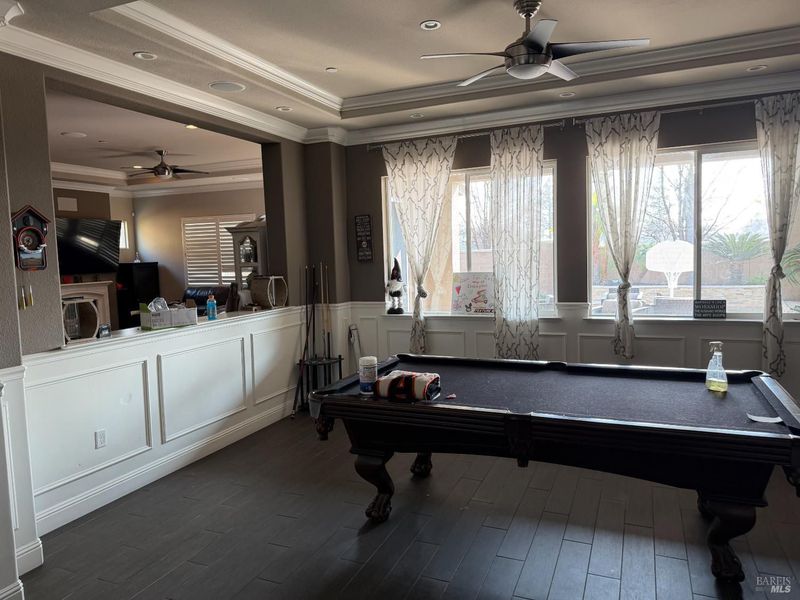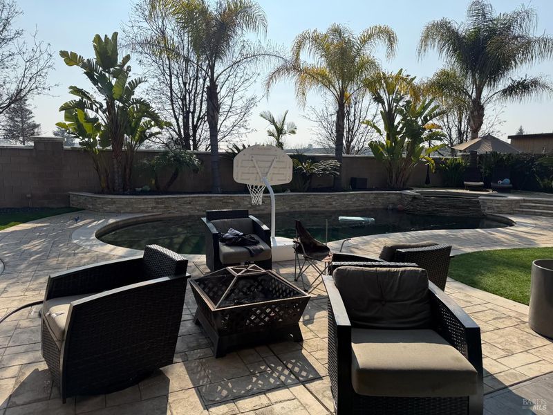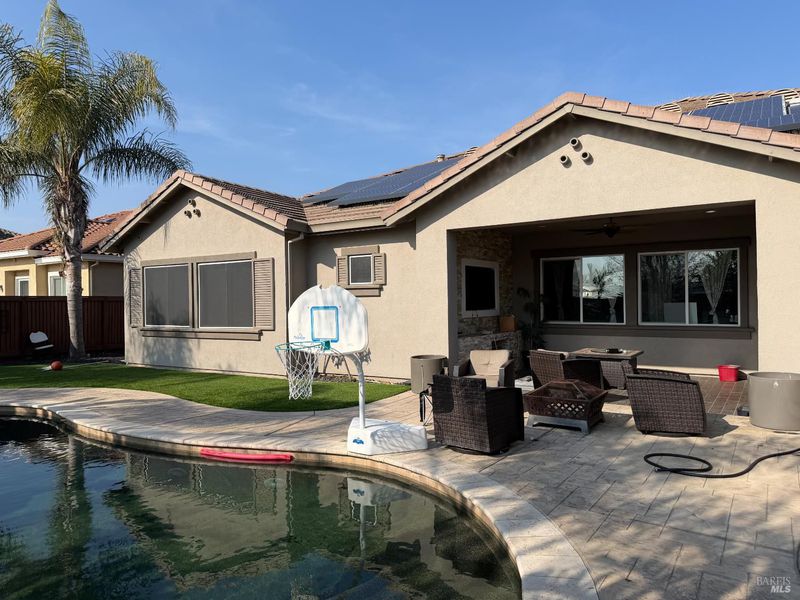 Beautifully upgraded home featuring an entertainer's dream backyard and stylish interior finishes throughout. Enjoy an open-concept layout with a spacious kitchen, oversized island, and abundant natural light flowing into the main living areas. Step outside to your private oasis complete with a covered patio, built-in outdoor kitchen, fireplace lounge area, and a sparkling pool surrounded by lush landscaping and palm trees. Inside, you'll find upgraded flooring, elegant trim work, and an entertainment space perfect for a game room, media room, or flex living area. Designed for both relaxing and hosting, this home offers the perfect blend of indoor comfort and outdoor luxury.
