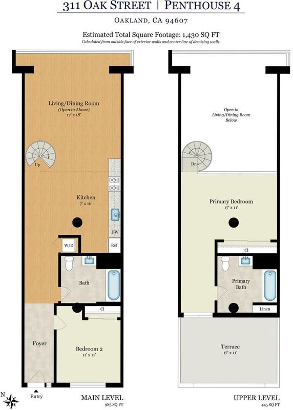 Compelling penthouse opportunity in full amenity building! Elevated living can be yours in this stunning two bedroom two bathroom penthouse at The Sierra at Jack London Square. Designed by award-winning Kava Massih Architects. This top-floor residence combines soaring 18-ft ceilings, floor-to-ceiling bay window with breathtaking city views, and refined finishes throughout. The main level boasts a dramatic limestone entry, hardwood floors, sleek kitchen with refinished cabinets, new refrigerator, sunlit bedroom, Italian porcelain bath, and in-unit laundry. Upstairs, a private loft suite includes a spacious ensuite bath and a large private terrace ideal for upscale entertaining or tranquil mornings. Thoughtful upgrades include new carpet, designer paint, Lutron dimmers, recessed LED fixtures, custom closets, and air conditioning. Includes two rare side-by-side garage spaces. Enjoy full-service luxury amenities: fob access control building, 24/7 concierge, heated lap pool, fitness center, sauna, media room, two conference rooms, bicycle storage, and WIFI in select common areas. Walk Score of 93, walk to trendy Jack London Square, waterfront dining, wineries, breweries, coffee houses, live entertainment, farmer's market, Oakland estuary, SF Ferry, BART, Amtrak, freeways and more.